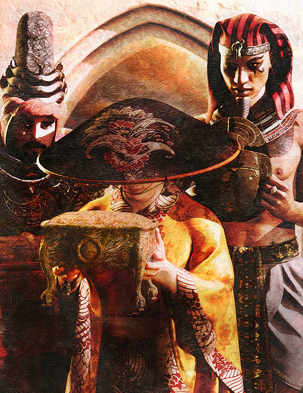 My recreation of the classic theme showcases the different ethnicities of these oriental kings, and had them dressed in accordance with their cultures and stations. They're also bearing their traditional gifts of gold, frankincense and myrrh