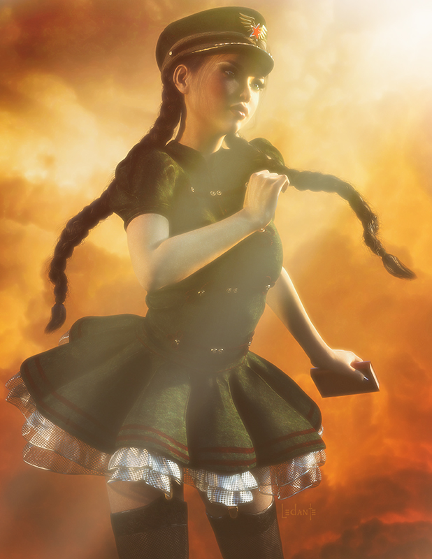 I might add that while her uniform may resemble one country’s or another’s, it does not belong to any nation or army. Any similarities to an existing uniform are purely coincidental